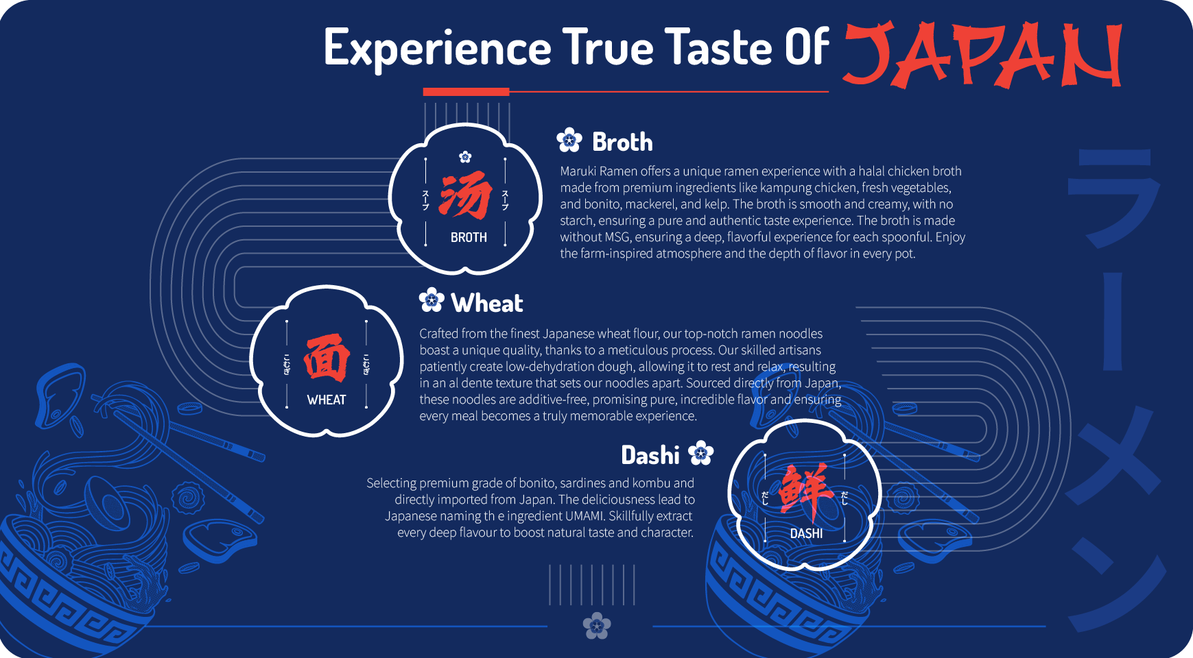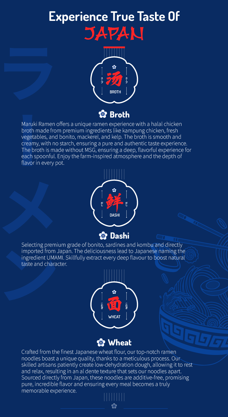 About UsPurity of essence is our philosophy of taste. Premium quality and natural ingredients from Japan are carefully selected to craft a bowl of Ramen. Our unique Dashi, flavoured oil and moto tare create comfort delicate, umami bursting in every bowl. Ambitious to offer classic ramen experience without any artificial components and flavouring, serving nutrition quality food for all .